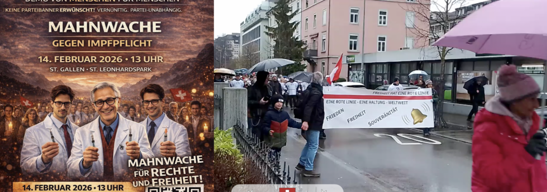 NEIN zum Impfzwang – Kundgebung in St. Gallen am 14.02.2026 Veröffentlicht am Februar 16, 2026Februar 16, 2026 von Wolf Hoffman Mahnwache gegen Impfpflicht im Leonhardspark, St. Gallen – anschliessend Trychlerumzug Freiheit hat eine rote Linie Veröffentlicht in Startseite TOP 1 Beitrag.
