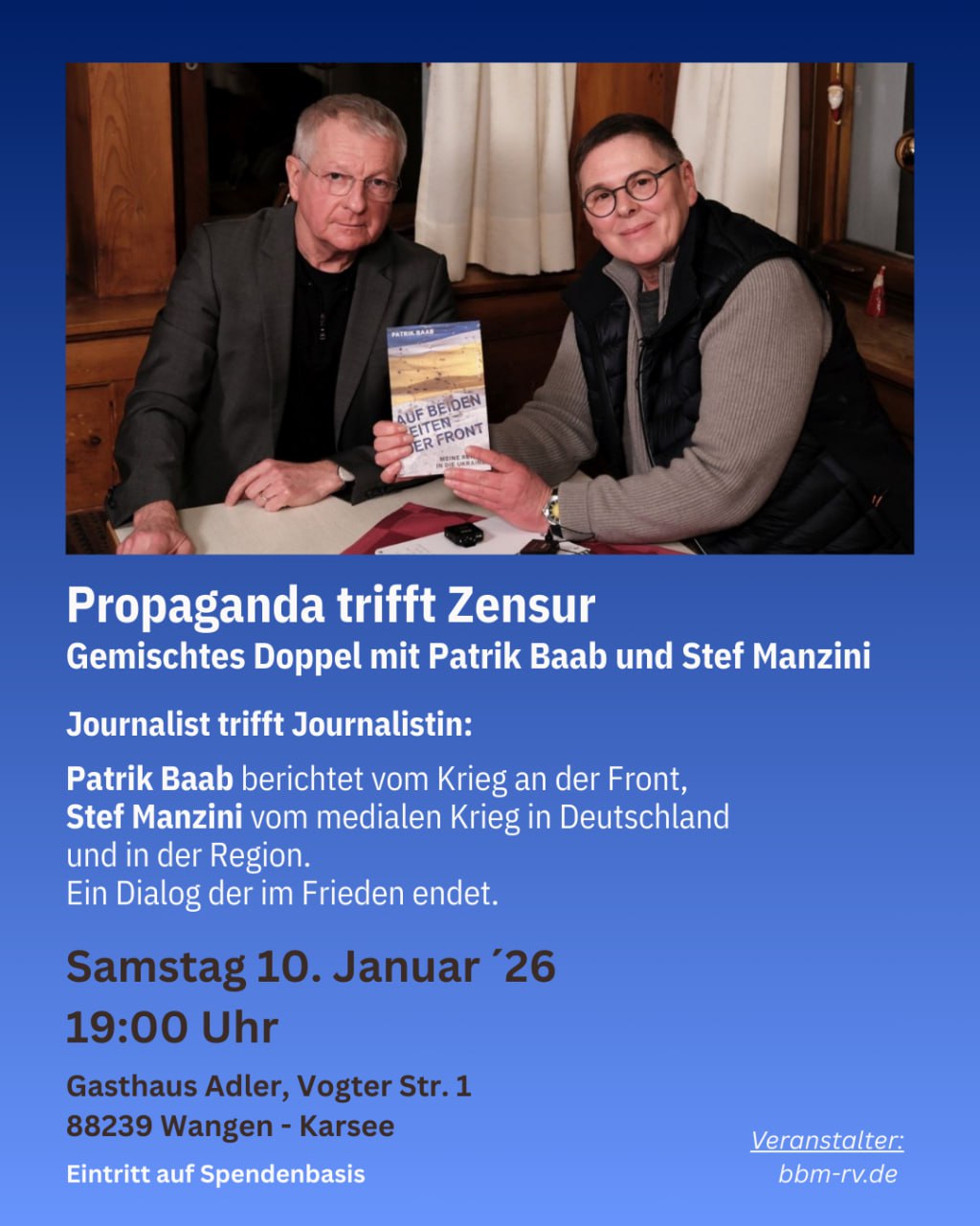 Patrik Baab berichtet vom Krieg an der Front, Stef Manzini vom medialen Krieg in Deutschland und in der Region.